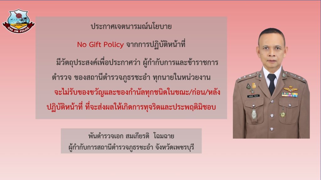 พ.ต.อ.สมเกียรติ โฉมฉาย ผกก.สภ.ชะอำ ร่วมกิจกรรมประชาสัมพันธ์ NO GiFt POlicy. ไม่รับขของขวัญ หรือสินบนของกำนัลทุกชนิด ของข้าราชการตำรวจทุกนายในหน่วยงาน