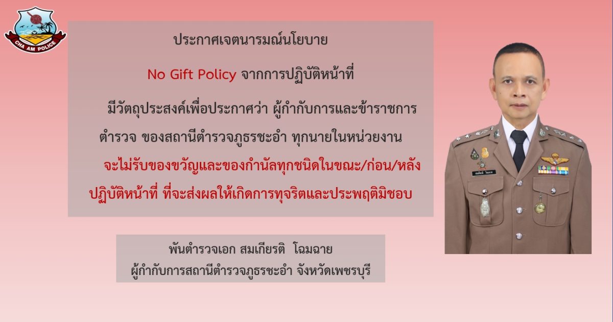 พ.ต.อ.สมเกียรติ โฉมฉาย ผกก.สภ.ชะอำ ร่วมกิจกรรมประชาสัมพันธ์ NO GiFt POlicy. ไม่รับขของขวัญ หรือสินบนของกำนัลทุกชนิด ของข้าราชการตำรวจทุกนายในหน่วยงาน