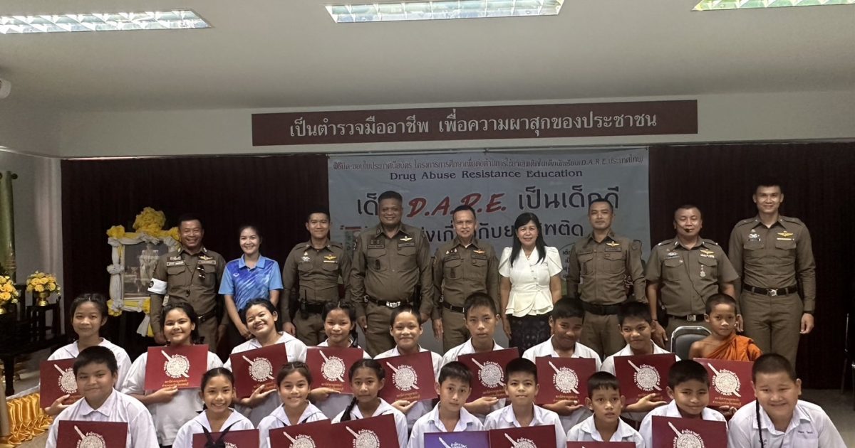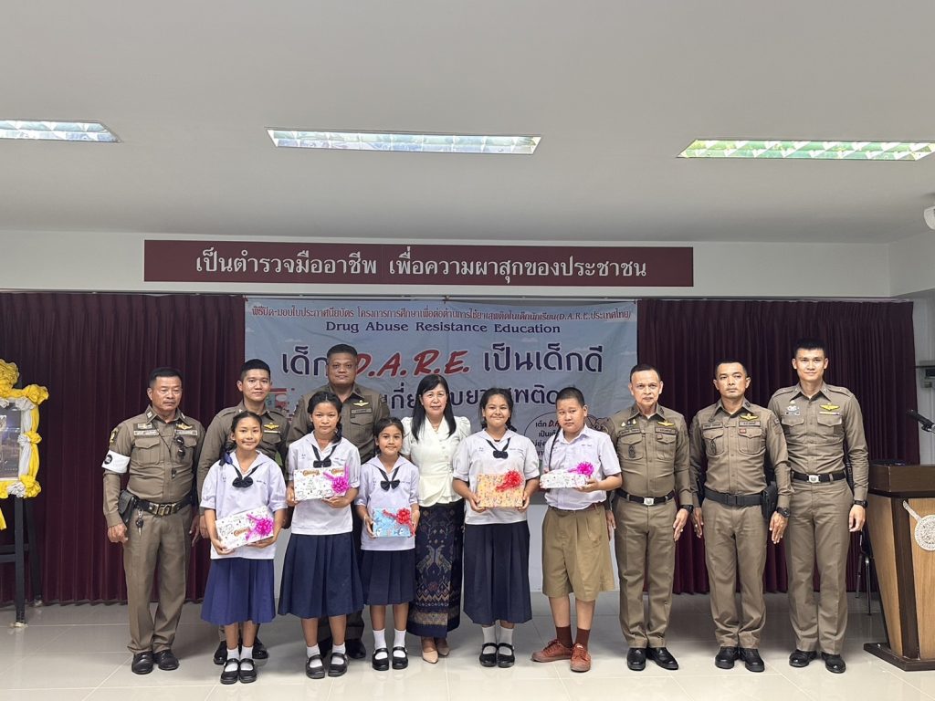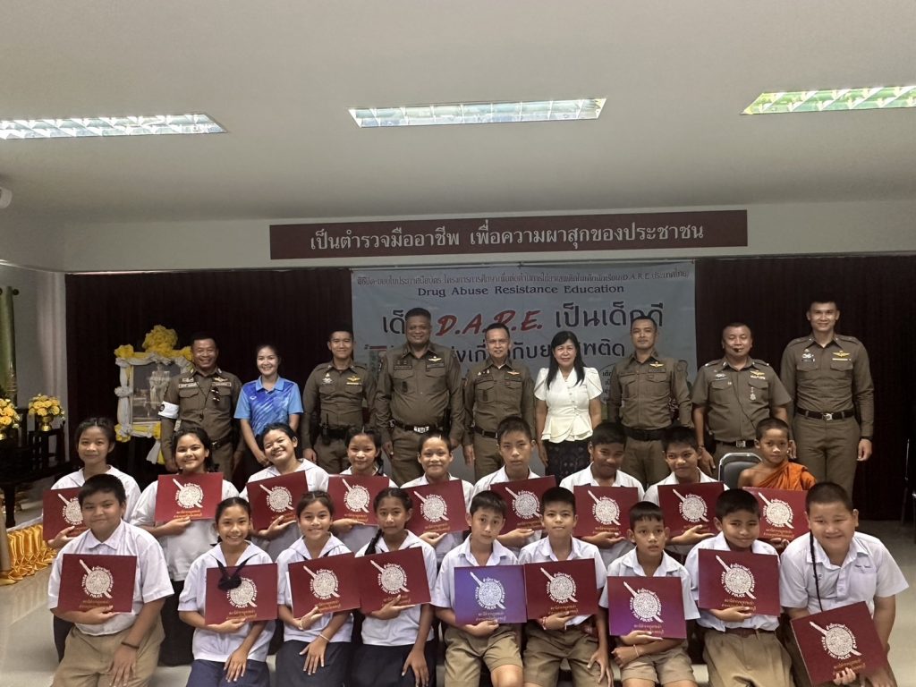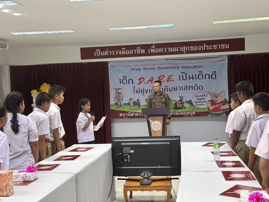 ข้าราชการตำรวจ(ทำหน้าที่ครูแดร์)พร้อมนักเรียนนายร้อยตำรวจ มอบใบประกาศนียบัตรให้แก่นักเรียนที่จบหลักสูตร โครงการการศึกษาเพื่อต่อต้านยาเสพติด (D.A.E.R.ประเทศไทย) โรงเรียนเทศบาล 3 วัดเนรัญชรา ณ ห้องประชุม สภ.ชะอำ
